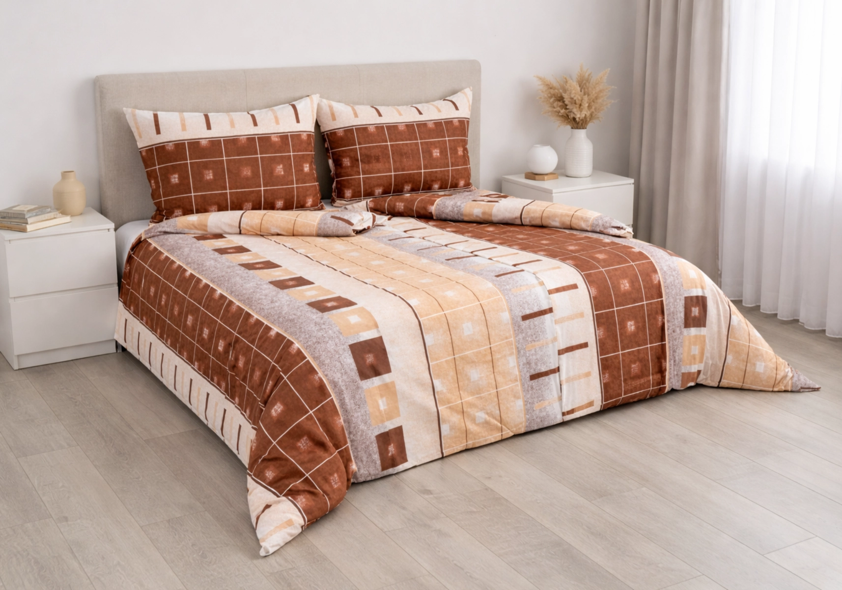 Moderní povlečení v elegantních béžovo-hnědých tónech s geometrickým vzorem, které dodá vaší ložnici útulný a stylový vzhled. Příjemný materiál zajišťuje pohodlný spánek a snadnou údržbu – ideální volba pro každodenní relax.
