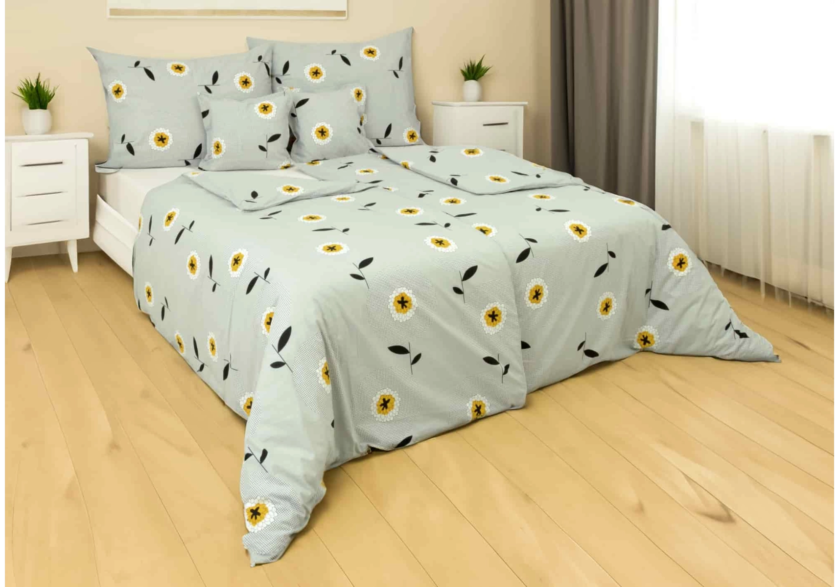 Bavlněné povlečení Žluté kytky na šedivém podkladu