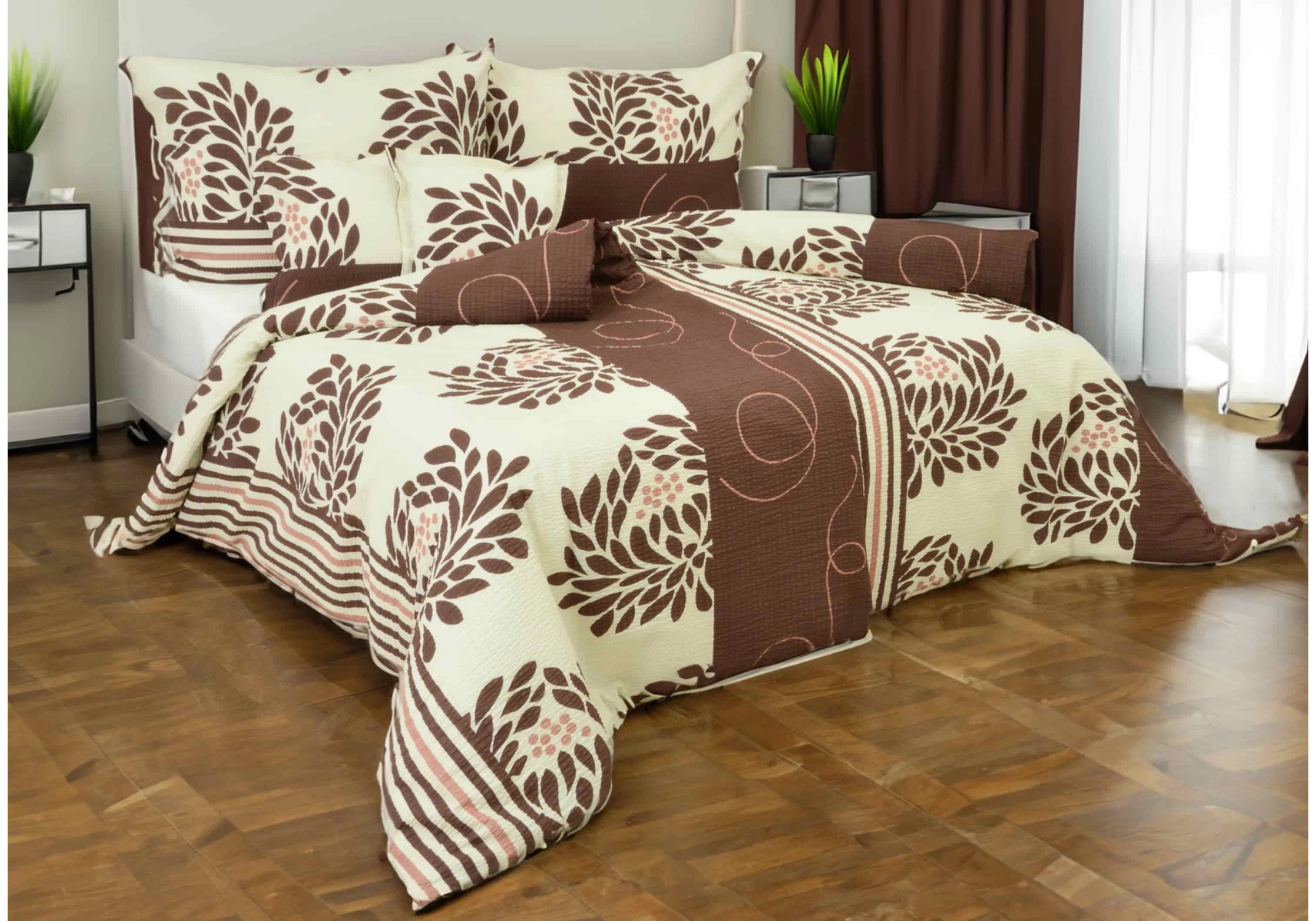 Krepové povlečení Hnědo béžové lístečky s pruhy