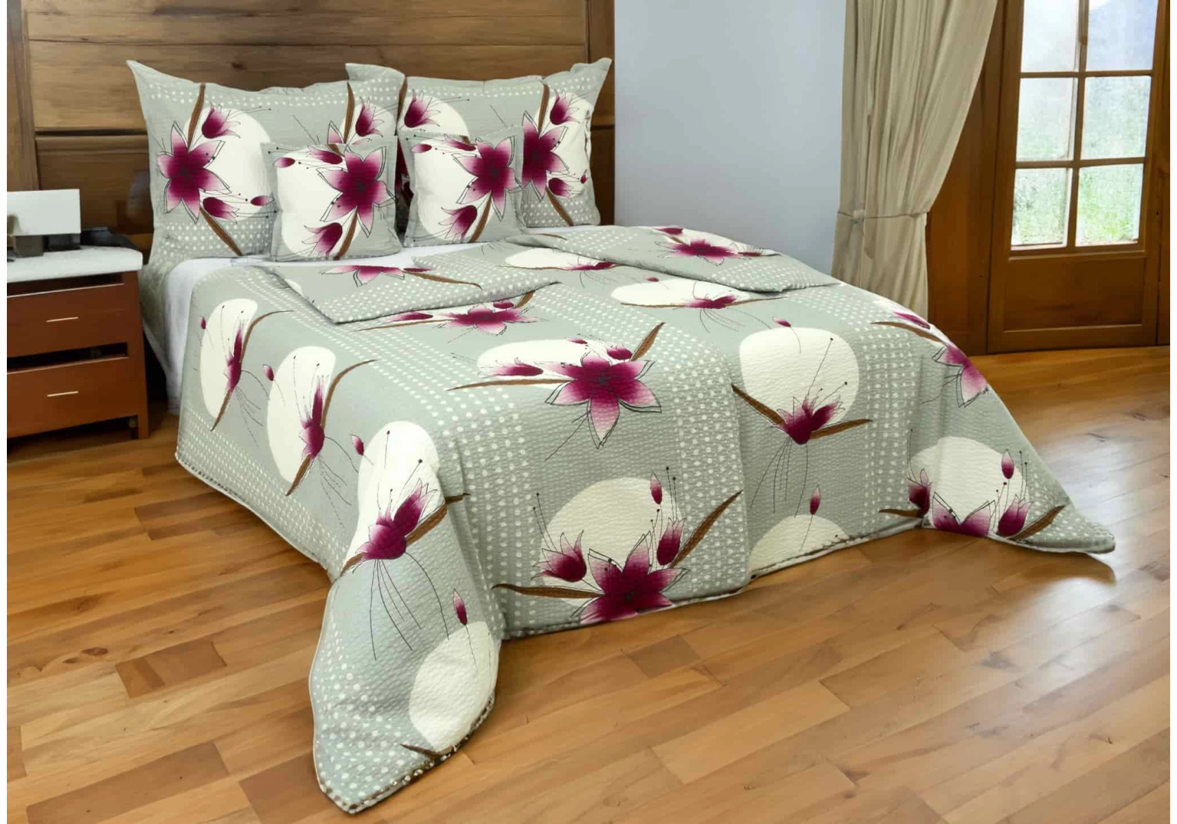 Šedá barva na podkladu má neuvěřitelně okouzlující a nadčasový odstín, na kterém úžasně vynikají nádherné květy v barvě bordó s hnědými lístky, které jakoby ležely na bílém měsíčním povrchu. Vzor s puncem elegance a luxusu vás zavede do říše snů protkaného kvalitním spánkem. Originální design oživí všechny ložnice.