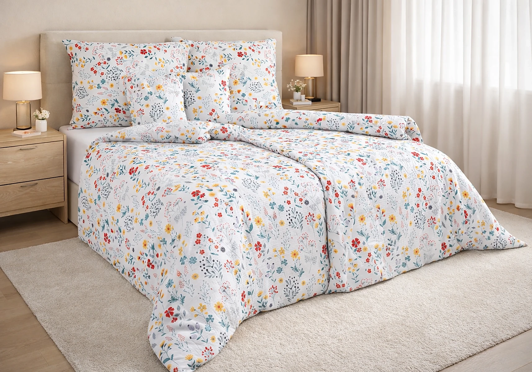 Objevte kouzlo přírody ve své ložnici s moderním lučním vzorem. Na bílém podkladu jsou žluté a červené květiny, které rozzáří váš interiér a přinesou do vašeho domova nádech jarního rána. Krepové povlečení je vyrobeno ze 100% bavlny.